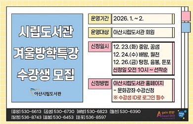 [충청25시] 아산시가 오는 23일부터 2026년 아산시립도서관 겨울방학 특강 수강생을 모집한다.