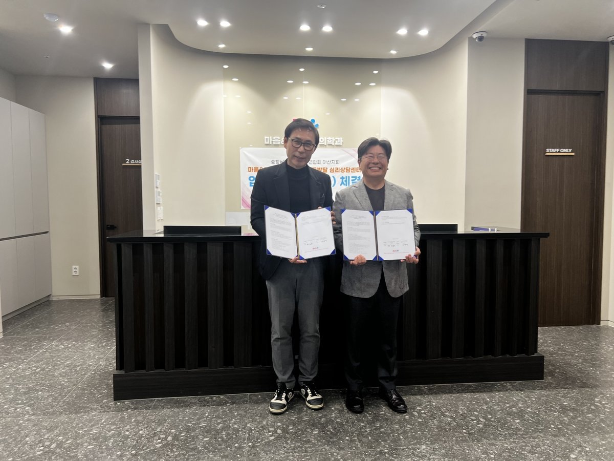 [충청25시] 충청남도어린이집연합회 아산지회와 마음&정신건강의학과의원 및 아동발달센터는 지난 12일 아산시 탕정면 소재 마음&정신건강의학과에서 지역 내 영유아의 건강한 성장과 조기 발달 지원을 위한 업무협약을 체결했다.