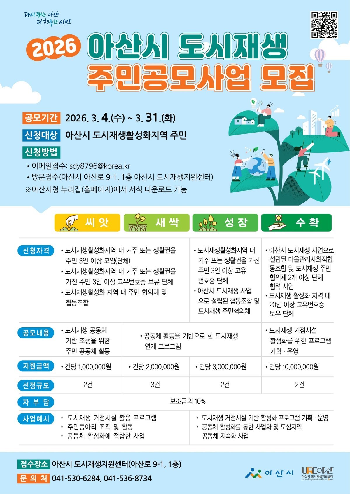 사업 규모와 지원 금액은 유형별로 차등 지원되며 세부 내용은 아산시청 누리집 및 도시재생지원센터 블로그 공고문을 통해 확인할 수 있다.