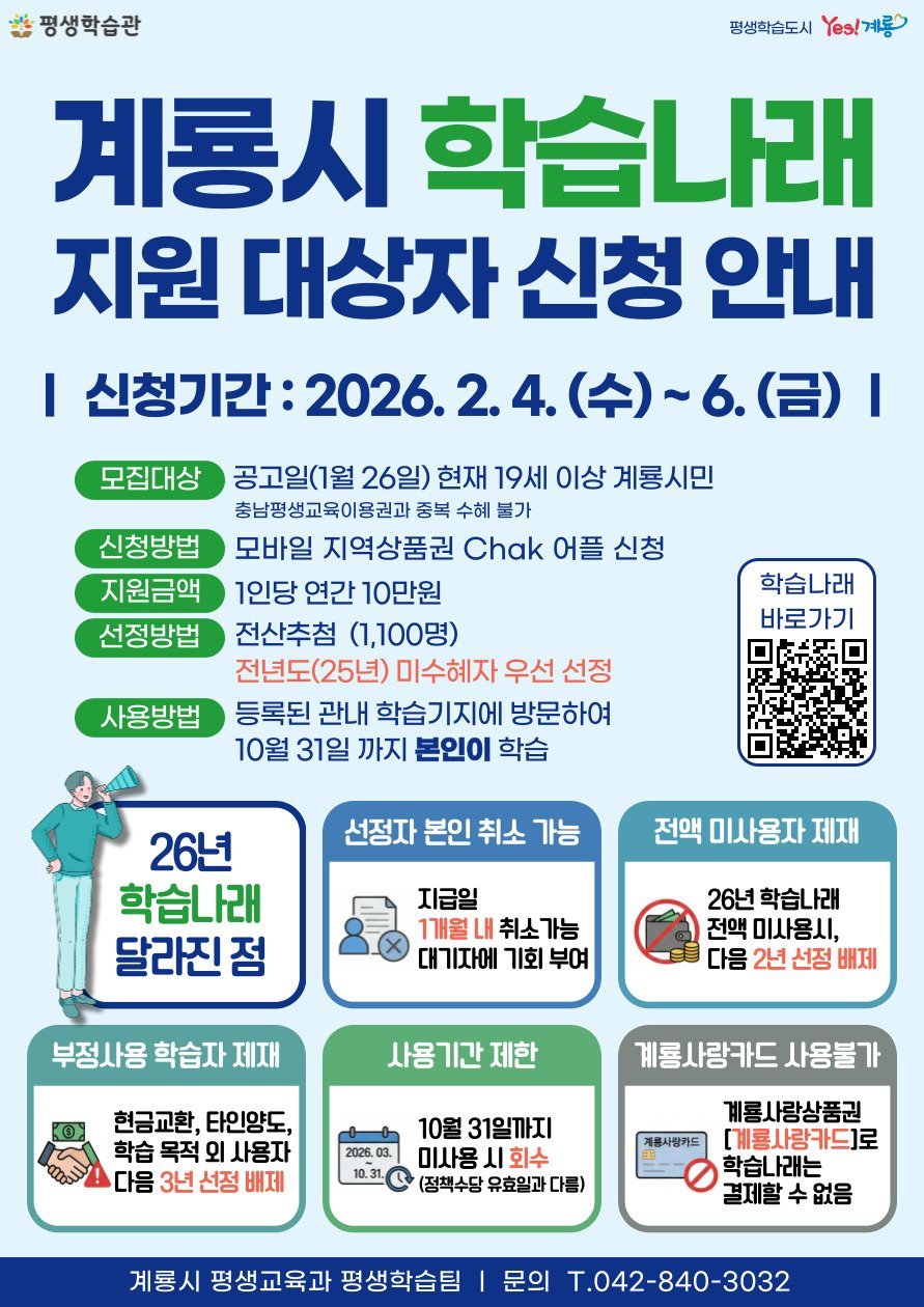 올해 학습나래 사업은 공고일 현재 19세 이상 계룡시민을 대상으로, 1인당 연간 10만 원의 평생학습 지원금을 총 1,100명에게 지급해 시민들의 자기계발과 역량 강화를 지원할 예정이다.
