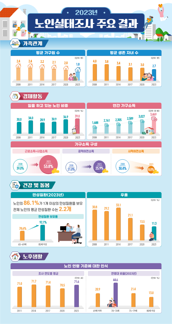 [충청25시] 보건복지부는 10월 17일 노인들의 가족·사회관계, 경제상태, 건강 및 생활상황 등에 관해 조사한 ‘2023년 노인실태조사’ 결과를 발표했다.