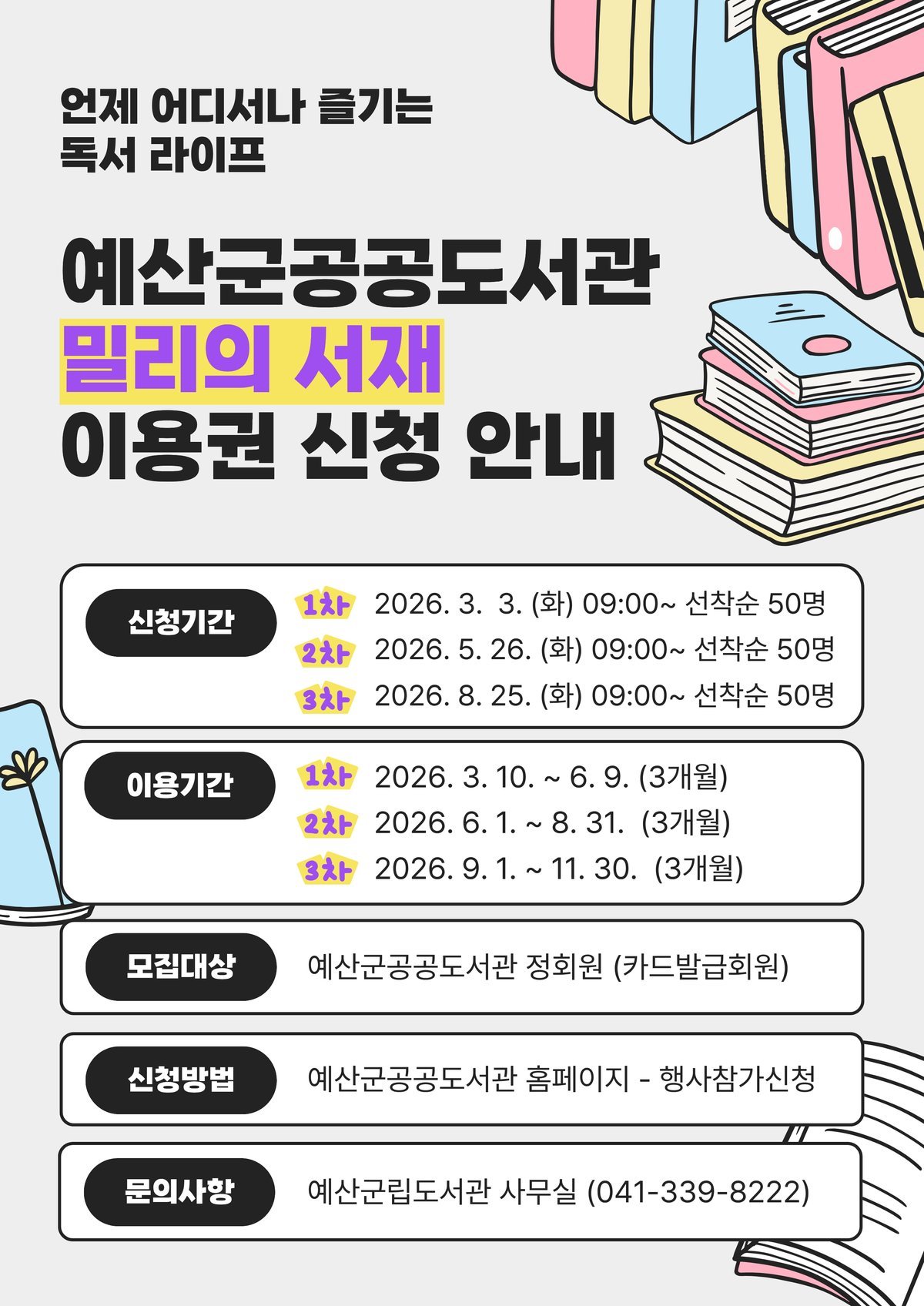 사업은 3월부터 12월까지 운영되며 군 공공도서관 정회원을 대상으로 구독형 전자책 서비스 이용권을 차수별로 배부한다.