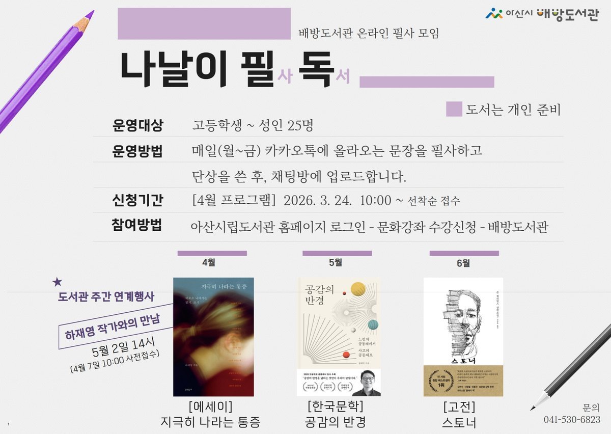 [충청25시] 아산시 배방도서관이 작년에 이어 올해 상반기에도 고등학생과 성인을 대상으로 온라인 필사 프로그램 ‘나날이 필독’을 운영한다.