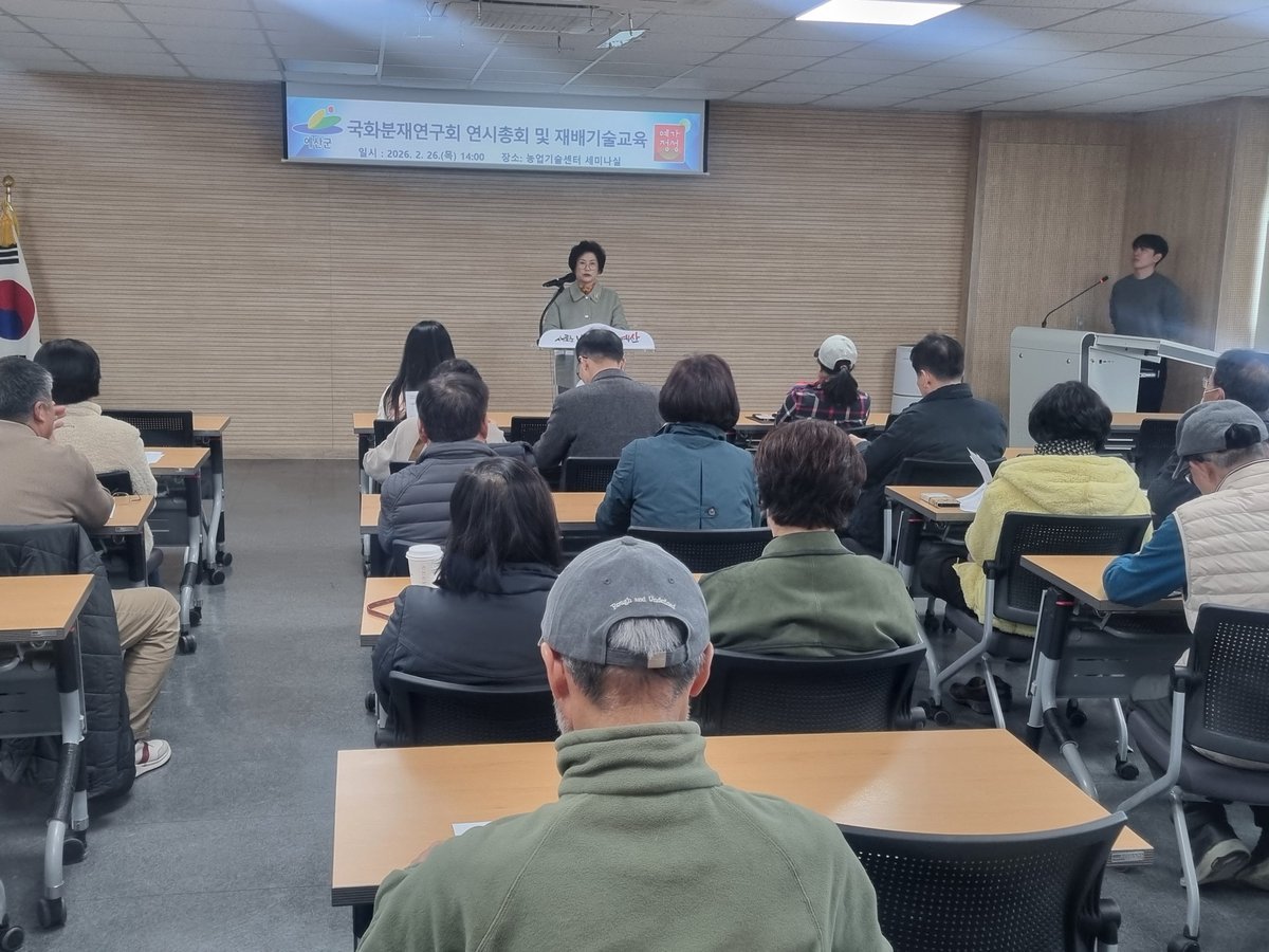 [충청25시] 예산군농업기술센터는 지난 26일 센터 2층 세미나실에서 국화분재연구회 연시총회와 재배기술교육을 실시했다.