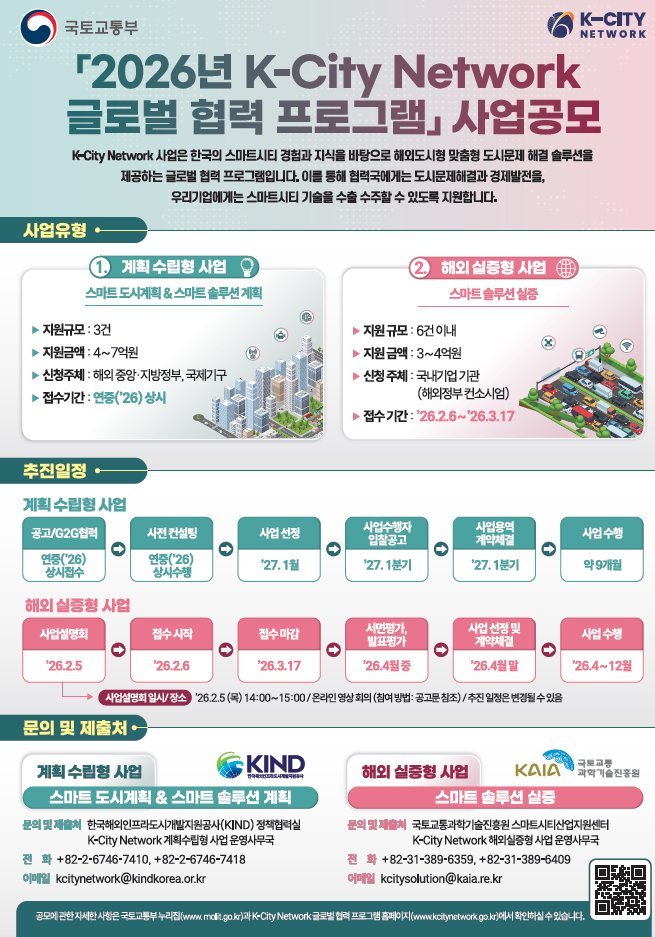 [충청25시] 정부가 국내 스마트도시 기술의 해외 진출을 지원하기 위해 올해「K-City 네트워크 글로벌 협력 사업*」 공모를 추진한다. 이번 사업을 통해 기업들은 해외 도시에서 자사 기술을 직접 실증하고, 현지 여건에 맞는 사업 모델을 검증해 실제 수주와 사업화로 이어질 수 있는 기회를 얻게 된다.