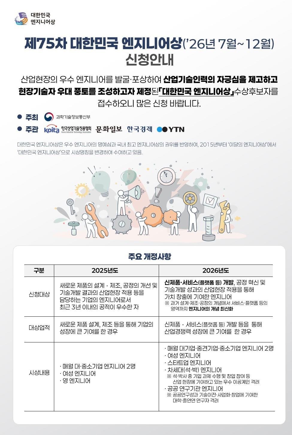 [충청25시] 과학기술정보통신부와 한국산업기술진흥협회는 과기정통부와 산기협 누리집에 제75차 ‘대한민국 엔지니어 상’ 선정계획을 1월 26일에 공고했다.