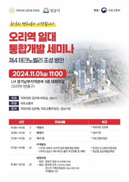 김은혜 의원과 국토부, 성남시가 함께하는 이번 세미나는 박상우 국토부 장관, 신상진 성남시 시장이 참석해 국회, 정부, 지자체의 적극 협력을 통한 오리역 통합개발에 대한 구체적인 추진 방향이 논의될 예정이다.
