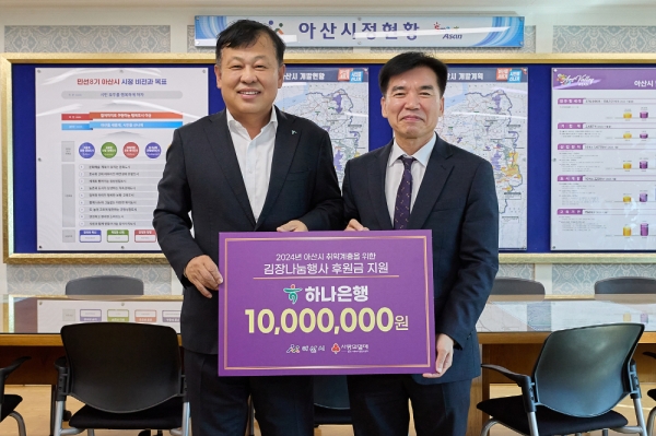 [충청25시] 하나은행이 지난 31일 아산시에 취약계층 대상 김장나눔행사를 위한 후원금 1,000만원을 전달했다.