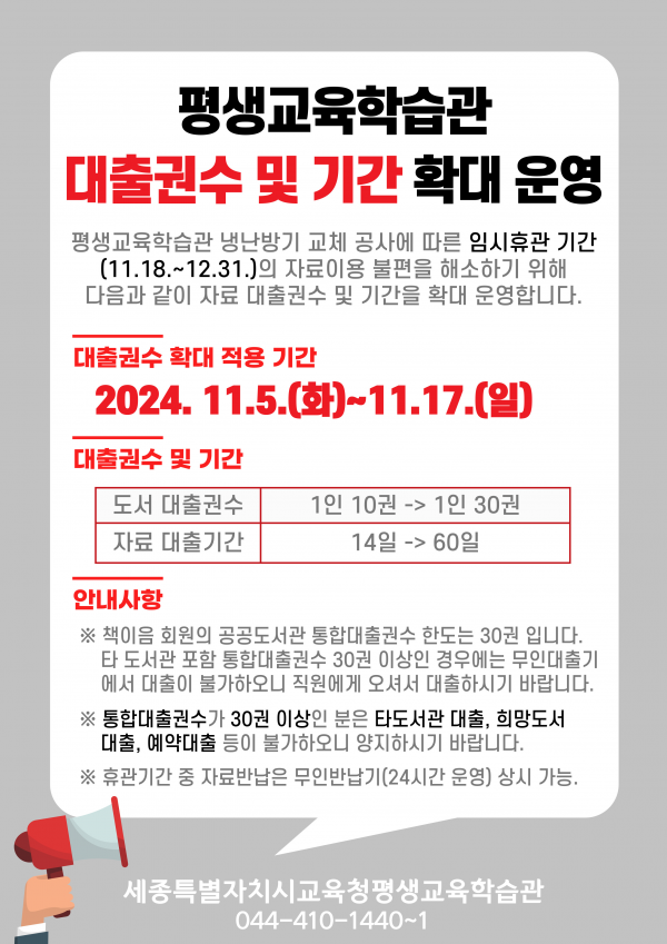 휴관 중 이용자들의 독서 공백을 최소화하기 위해 오는 11월 5일부터 11월 17일까지 ‘대출 확대 서비스 및 전자책 서비스’를 운영할 방침이다.