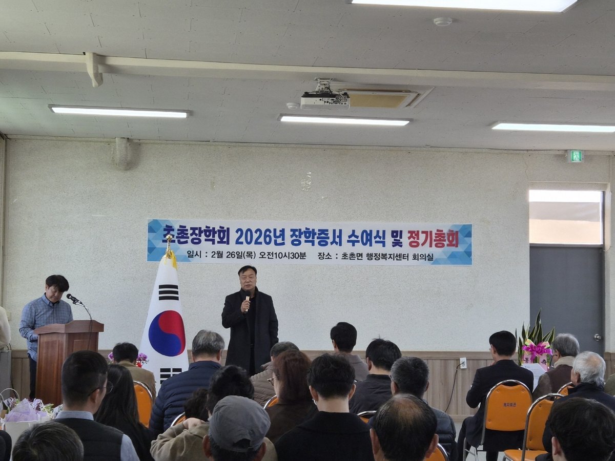 [충청25시] 및 정기총회 개최 - 지역 인재 11명에 장학금 전달, 미래 인재 육성 의지 다져 - 초촌장학회는 초촌면행정복지센터 회의실에서 2026년 초촌장학회 장학증서 수여식 및 정기총회 을 개최했다고 3일 밝혔다.