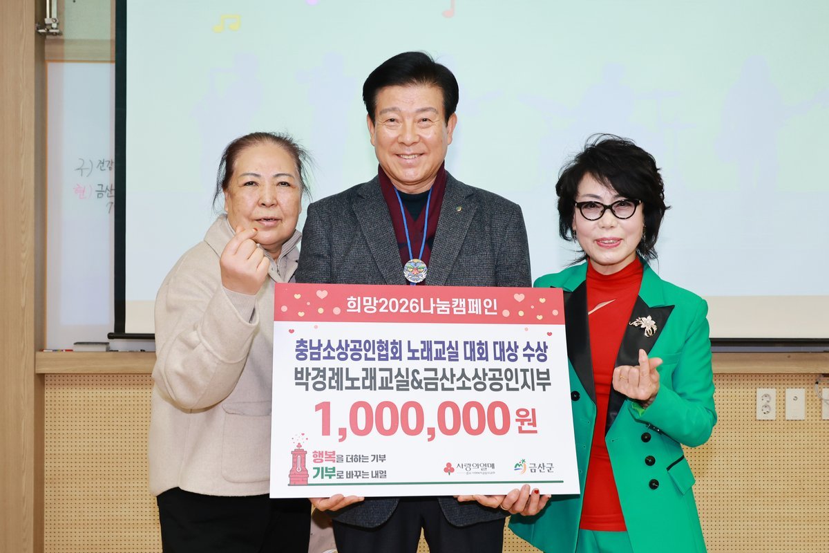 기탁식에는 박범인 금산군수, 길봉석 금산소상공인지부장을 비롯해 박경례 강사 및 노래교실 회원들이 참석해 나눔의 뜻을 함께했다.