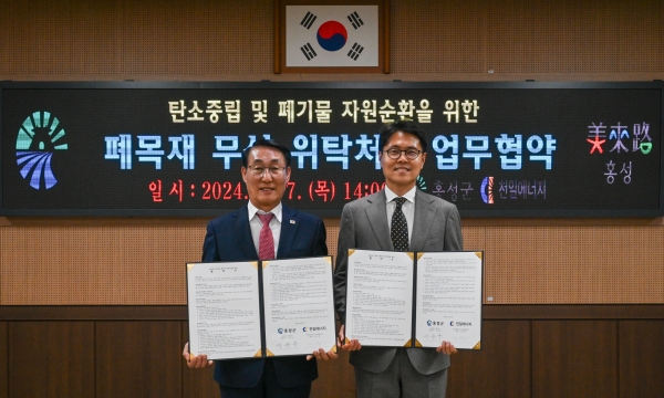 [충청25시] 홍성군은 7일 군수실에서 ㈜천일에너지와 ‘폐목재 무상 위탁처리 업무협약’을 체결했다.