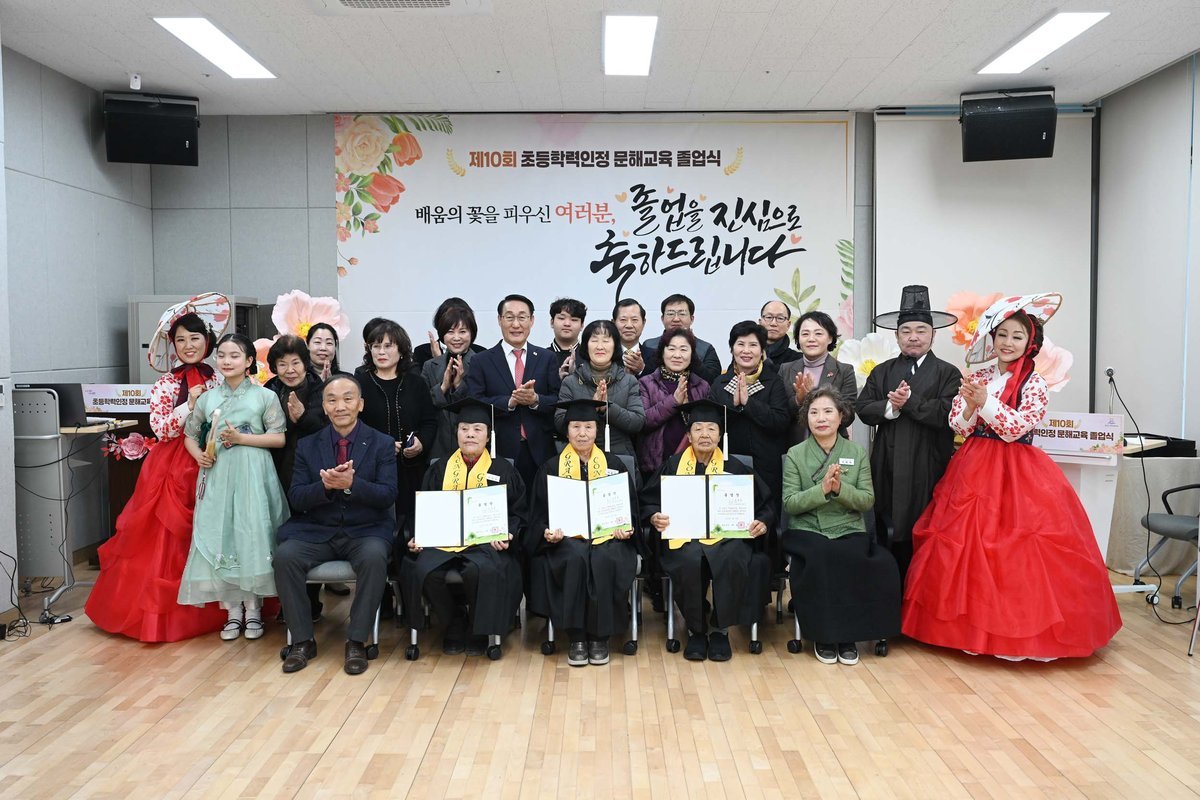 [충청25시] 홍성군은 지난 24일 3년간의 초등학력 인정 문해교육 프로그램을 이수한 학습자 4명의 초등학교 졸업식을 가졌다고 밝혔다.