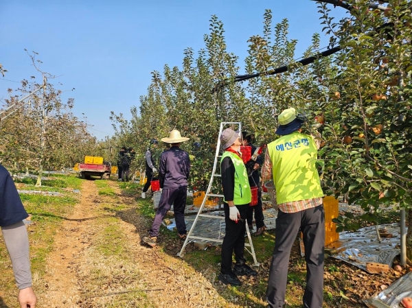 [충청25시] 예산군 수도과 직원 20여명은 지난 11일 고덕면 몽곡리 과수농가를 찾아 농번기 농촌일손 돕기를 실시하며 구슬땀을 흘렸다.