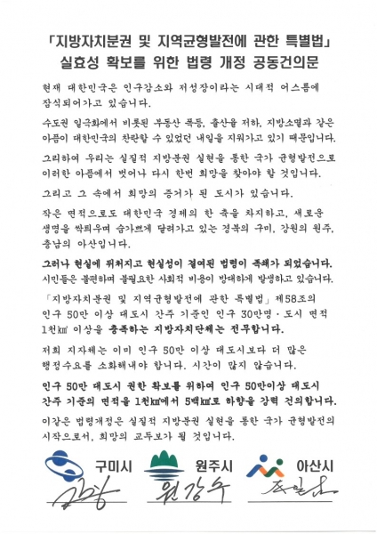 아산시는 “아산·구미·원주시는 인구 감소와 저성장, 지방소멸이라는 시대적 흐름에도 성장을 거듭하고 있는 국가균형발전의 희망 모델”이며 “조속한 법 개정으로 실질적 자치분권의 제도적 기반을 마련하고 수도권 집중화로 인한 여러 문제를 해결하는 전환점으로 삼아야 한다”고 밝혔다.