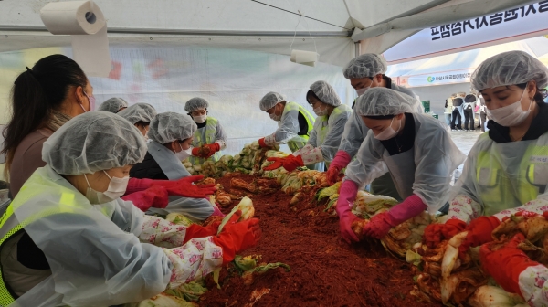 [충청25시] 아산시 수도사업소 직원들이 지난 12일 관내 취약계층의 따뜻한 겨울나기에 온기를 더하고자 이순신종합운동장 광장에서 진행된 ‘사랑의 김장 나누기’에 참여해 두 팔을 걷어붙였다.