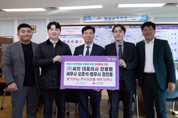 [충청25시] 아산시는 지난 13일 ㈜씨앗 대표이사 안용범, 세무사 오준석, 법무사 정찬웅으로부터 관내 취약계층을 위한 260만원 상당의 쌀 500kg, 휴지 600롤, 라면 50박스를 후원받았다고 밝혔다.