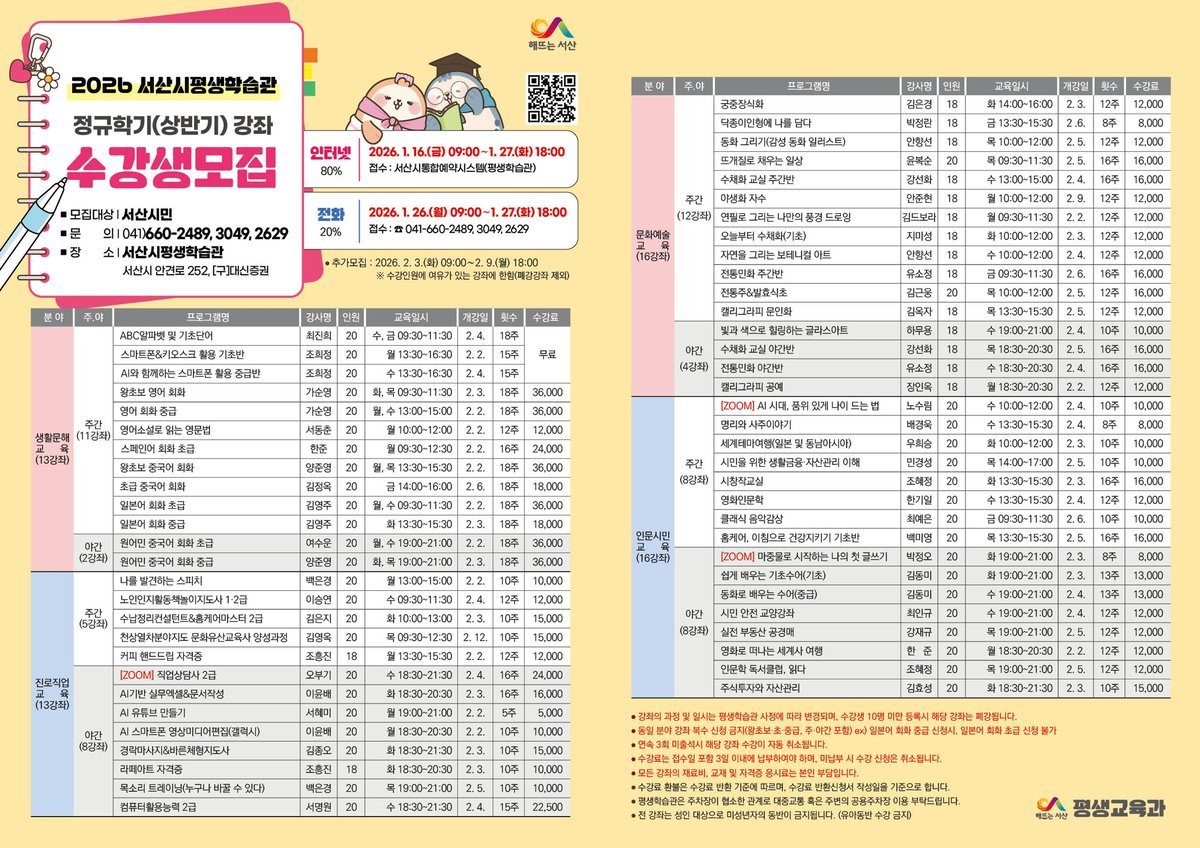 시는 서산시민대학 상반기 정규학기로 △생활문해 △진로직업 △문화예술 △인문교양 등 4개 분야 58개 강좌를 마련했다.
