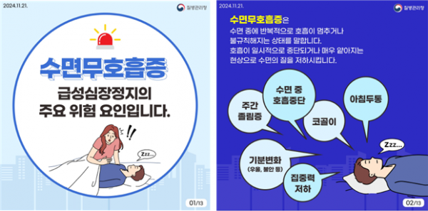 질병관리청에서 배포한 수면무호흡증 카드 뉴스는 국가손상정보포털 및 질병관리청 누리집에서 확인할 수 있다.
