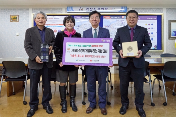 [충청25시] 아산시가 지난 21일 충남 강하게공부하는기업인회로부터 관내 취약계층 지원을 위한 500만원 상당의 겨울용 목도리 100개를 후원받았다.