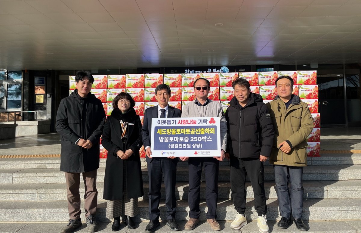 기탁 물품은 세도방울토마토공선출하회 회원들이 정성껏 생산한 방울토마토즙으로 부여군을 통해 관내 저소득층 가정에 전달될 예정이다.