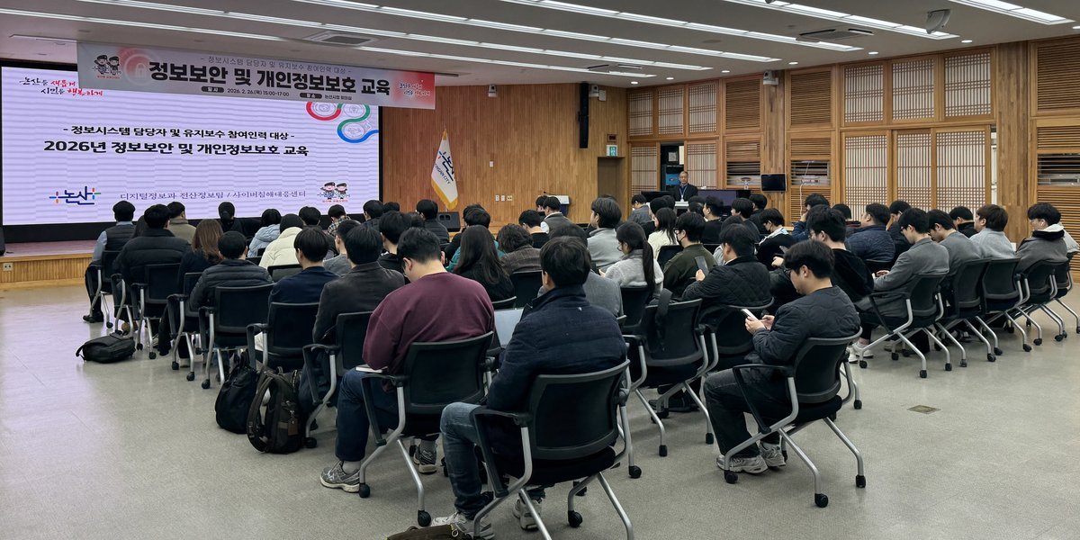 [충청25시] 논산시는 26일 시청 회의실에서 정보시스템 담당자와 유지보수 참여 인력 105명을 대상으로 ‘정보보안 및 개인정보보호 교육’을 실시했다.