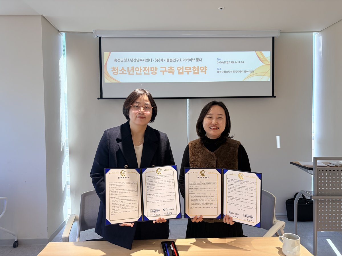 [충청25시] 홍성군이 홍성군청소년상담복지센터가 지난 25일 자기돌봄연구소 아카이브 품다와 2026년 청소년안전망 구축을 위한 업무협약 을 체결했다고 밝혔다.