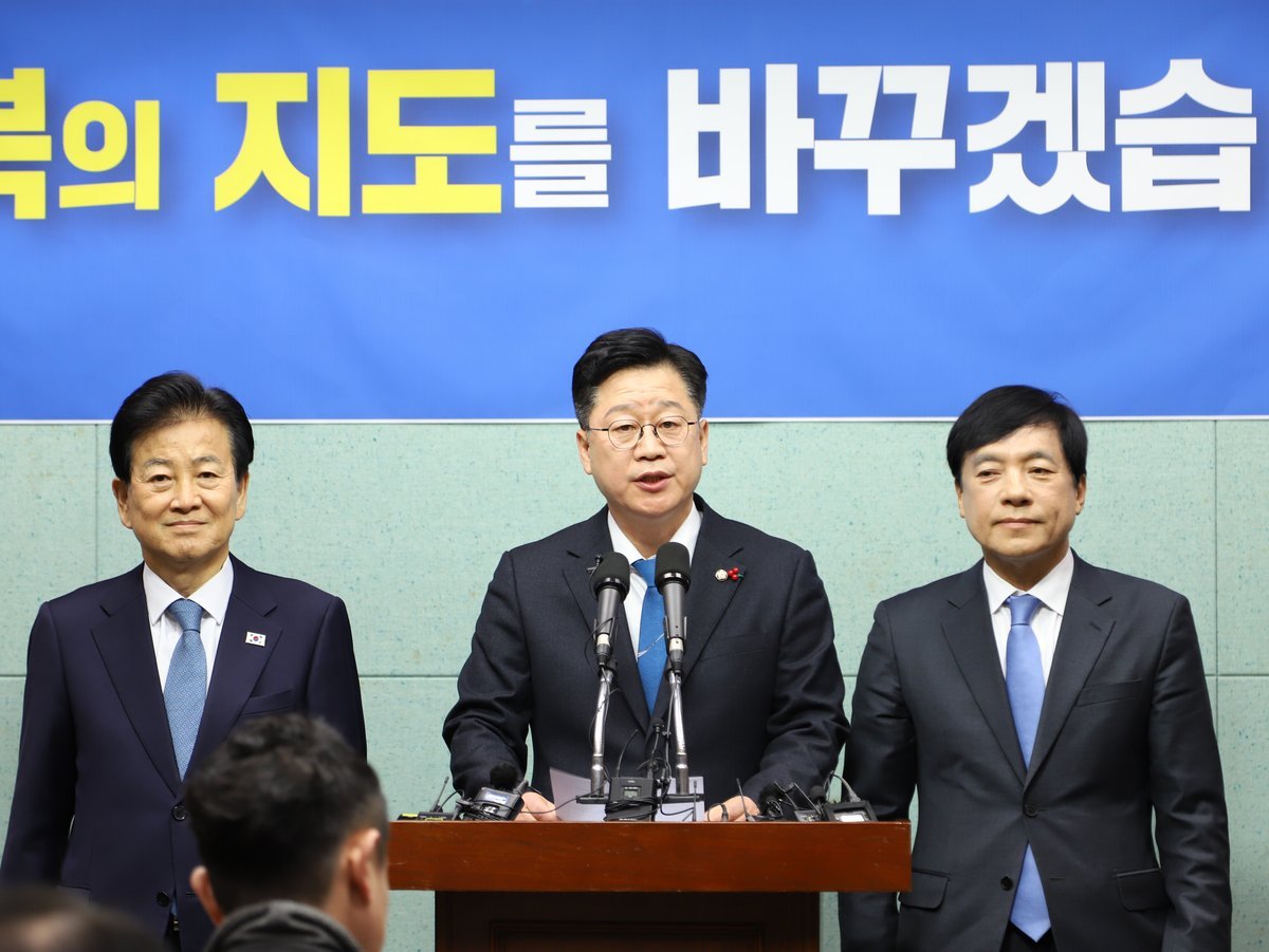 [충청25시] 전북도지사 출마를 선언한 안호영 국회 기후에너지환경노동위원장은 2일 기자회견을 열고 회견에 동석한 정동영 통일부 장관과 이성윤 더불어민주당 최고위원, 동참 의사를 밝힌 김윤덕 국토교통부 장관과 함께 전주·완주 행정통합을 추진하겠다는 입장을 밝혔다.