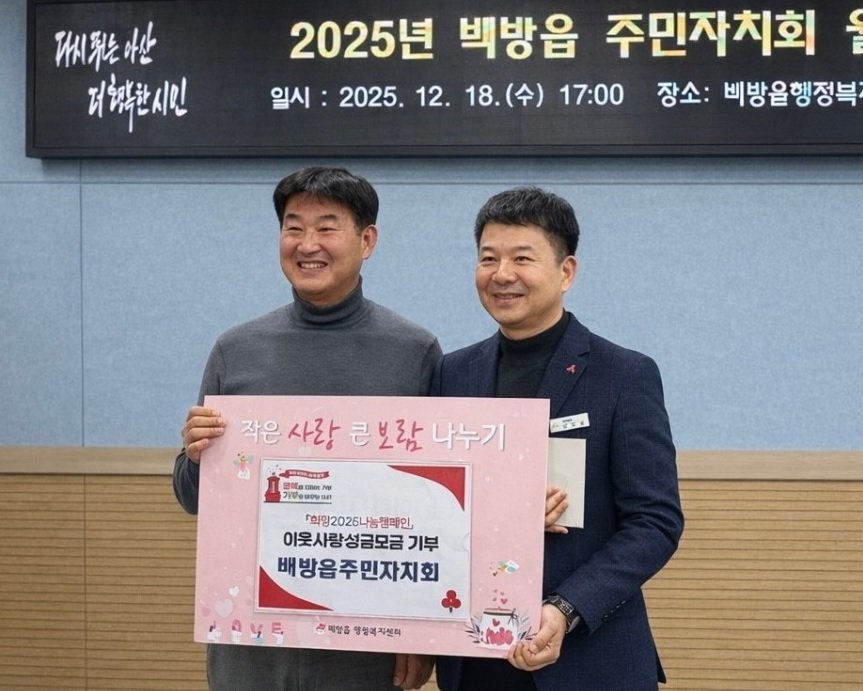 오홍표 회장은 “배방읍 주민자치회가 마련한 성금이 소외된 이웃들에게 조금이나마 힘이 되길 바란다”며 “앞으로도 연말뿐만 아니라 일상 속에서 나눔과 봉사를 꾸준히 실천하겠다”고 말했다.
