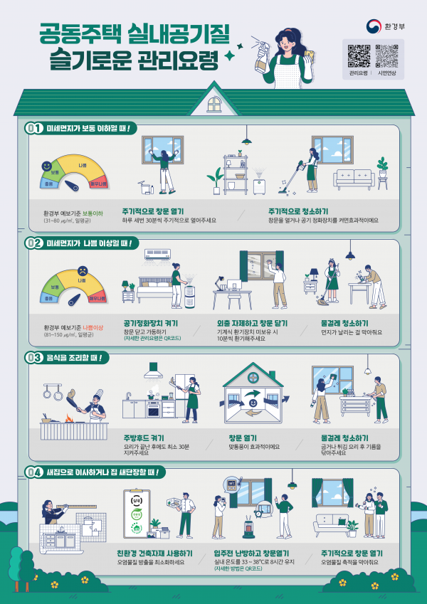 홍보자료는 공동주택에서 미세먼지 고농도 시, 조리 시, 입주 시 등 상황별로 적용할 수 있는 관리방안을 담았다.