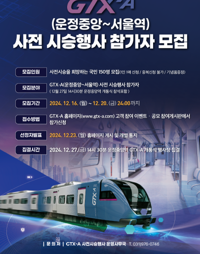 GTX-A 개통식 및 사전 시승식 행사 참가자 모집은 GTX-A 누리집을 통해 16일부터 5일간 진행되며 우리나라 국민 누구나 지원 가능하다.