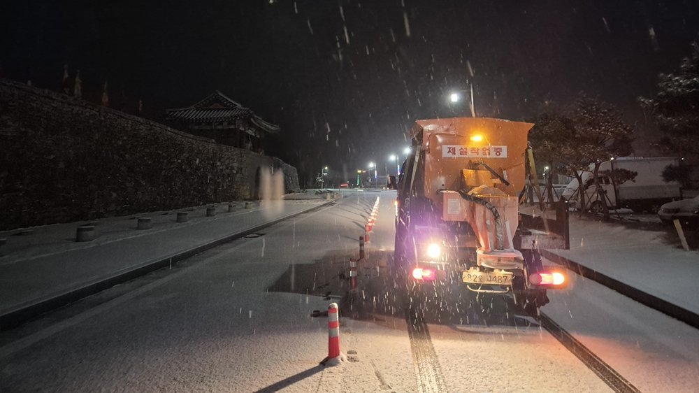 시에 따르면, 이날 새벽부터 내린 눈이 도로에 쌓여 현장 예찰과 함께 경사도로 결빙 취약 구간 중심의 제설 작업이 진행됐다.