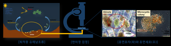 그러나 퇴적층에 존재하는 유해남조류는 토양 입자, 유기물 등과 흡착되어 쉽게 구분되지 않아 현미경으로 세포 형태를 구별하고 밀도를 측정하는 데 한계가 있다.