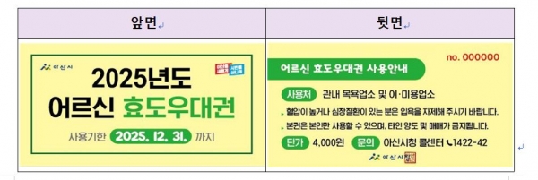 지급대상은 2024년 12월 31일 기준으로 아산시에 주민등록을 두고 거주하는 65세 이상 어르신이며 1인 10매를 지급한다.