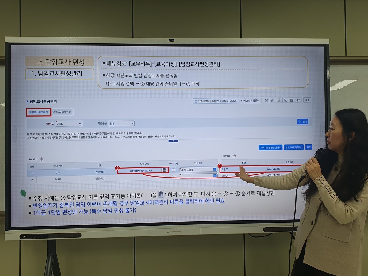 이번 연수는 학사일정, 입학, 출결 관리 등 교무업무 기능 개선 사항과 유아학비 청구·정산 등 실무 중심 과정을 다루었다.