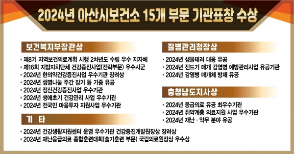 [충청25시] 아산시보건소는 2024년 보건의료 분야의 뛰어난 성과를 인정받아, 보건복지부·질병관리청·충청남도 등 주요 기관들로부터 총 15개 분야에서 우수기관으로 선정되는 쾌거를 이뤘다.