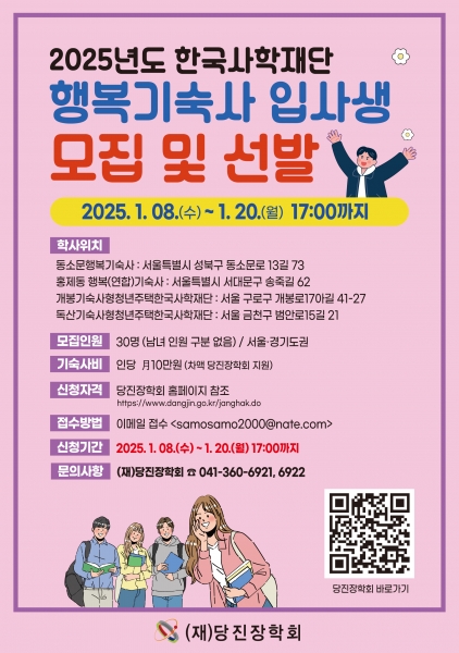 당진장학회에서는 동소문, 홍제동 행복기숙사 입사생 28명, 천안 행복기숙사 입사생 20명, 개봉동과 독산동 기숙사형 청년주택 입사생 각 1명씩을 모집한다.