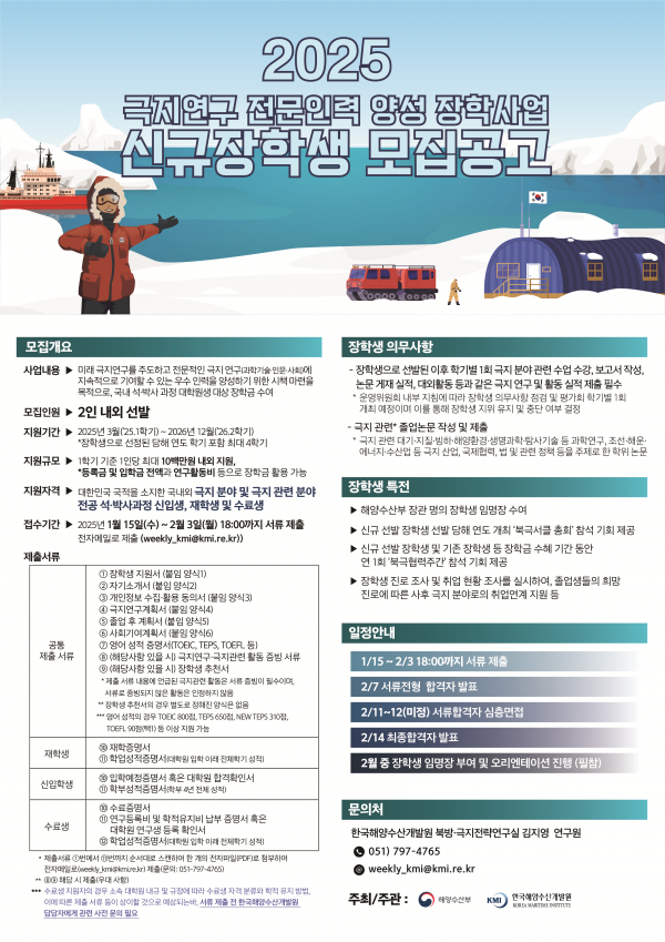 [충청25시] 해양수산부는 1월 15일부터 2월 3일까지 대한민국 국적의 극지 관련 분야 전공 석·박사과정생을 대상으로 ‘제3차 극지연구 전문인력 양성 장학사업’의 장학생을 모집한다.