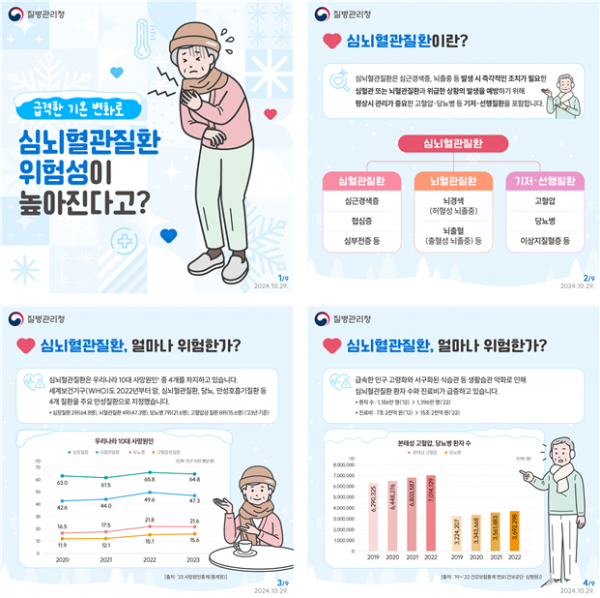 또한 무엇보다 예방의 중요성을 강조하며 “아무리 잘 관리한다고 해도 뇌졸중·심근경색증에 가장 좋은 대처는 ‘예방’인 만큼 금연·절주 등 생활습관 개선, 고혈압·당뇨병 등 만성질환을 적절하게 치료·관리하는 등 ‘심뇌혈관질환 예방관리를 위한 9대 생활수칙’을 꾸준히 실천해 주실 것”과 함께, 특히 “안전한 설 연휴가 될 수 있도록 어르신, 만성질환자, 과거 병력이 있는 고위험군은 장시간 외출을 자제하거나 외출 시에도 보온을 유지하는 등 추위에 갑작스럽게 노출되지 않도록 겨울철 건강관리의 중요성”을 당부했다.
