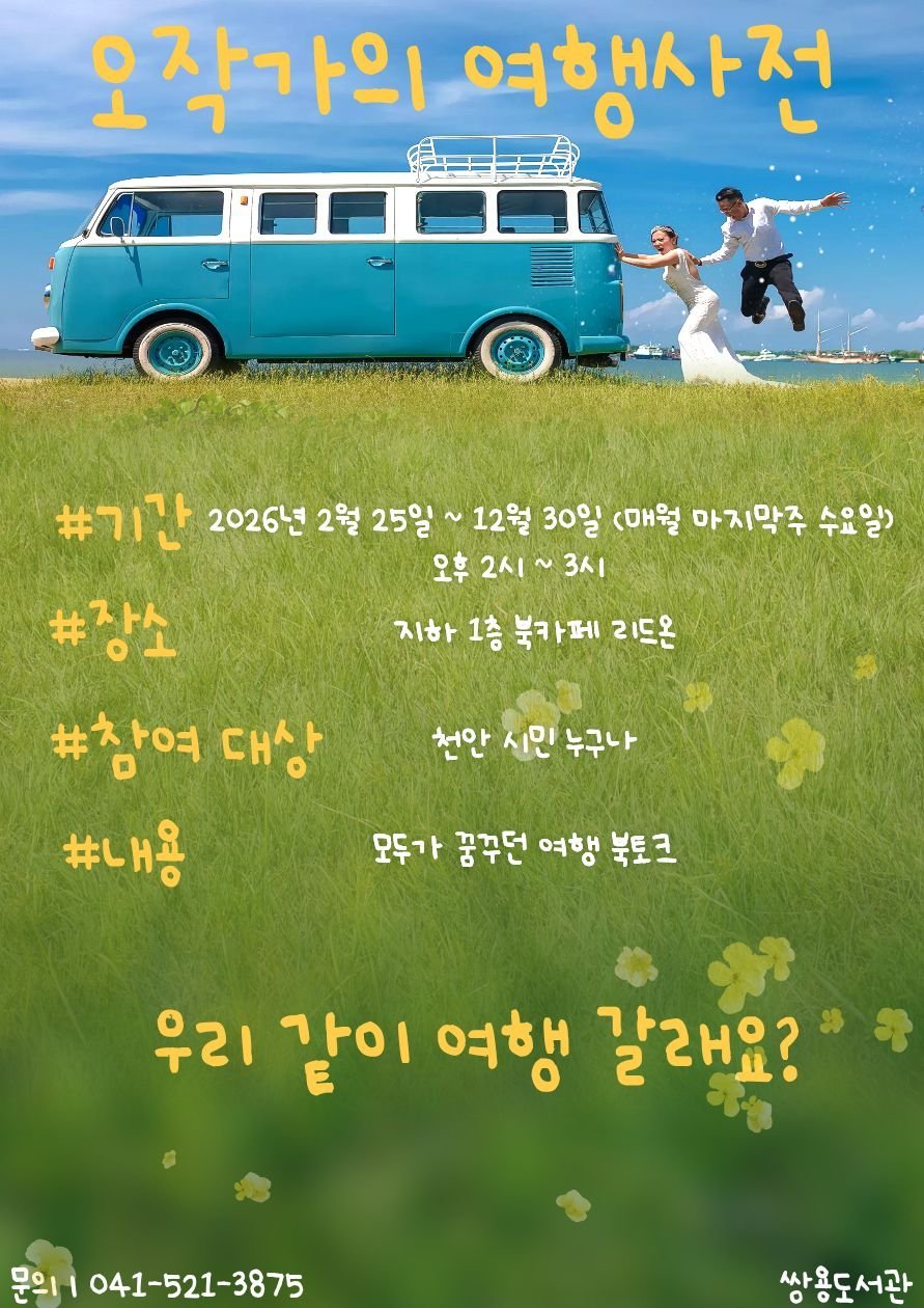 [충청25시] 천안시 쌍용도서관은 문화가 있는 날을 맞아 여행 강연 프로그램 ‘오작가의 여행 사전’을 운영한다고 19일 밝혔다.