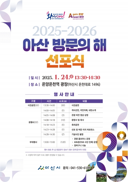 [충청25시] 아산시가 24일 온양온천역 광장에서 ‘2025~2026 아산 방문의 해 선포식’을 통해 아산 방문의 해를 본격적으로 개막한다.