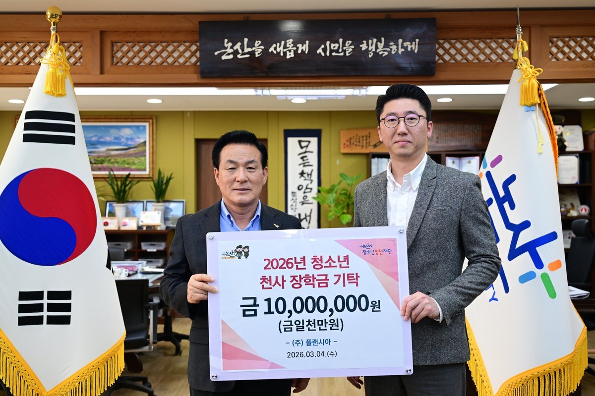 [충청25시] 논산시청소년청년재단은 지난 4일 ‘플랜시아’가 지역 청소년을 위한 천사 장학금 1천만원을 기탁했다고 전했다.