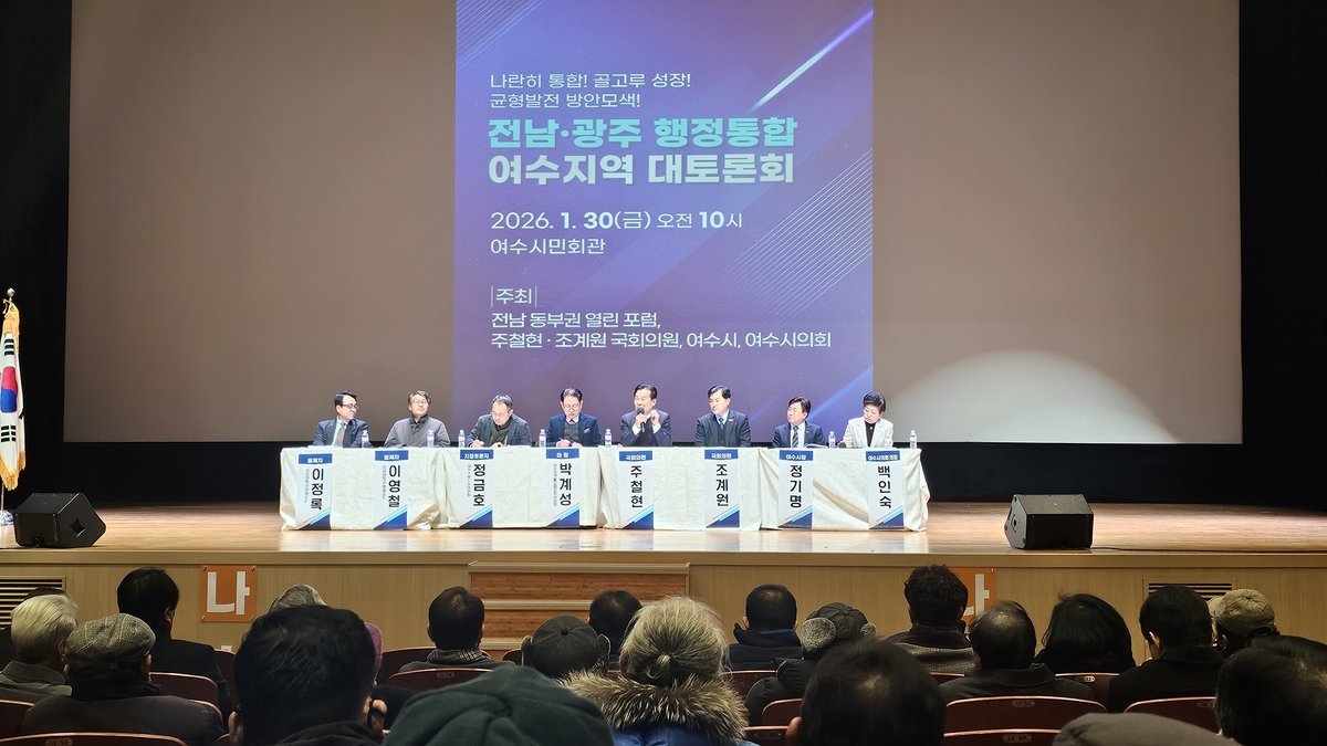 [충청25시] 주철현·조계원 국회의원은 여수시, 여수시의회, 전남동부권 열린포럼과 함께 '전남·광주 행정통합 여수지역 대토론회'를 30일 여수시민회관에서 공동 개최하고 전남 동부권의 주요 현안과 행정통합 방향을 놓고 시민 의견을 수렴했다.