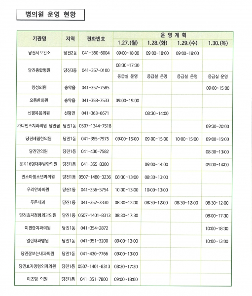 [충청25시] 당진시는 설 연휴인 1월 27일부터 30일까지 문 여는 병의원과 약국을 지정·운영한다.
