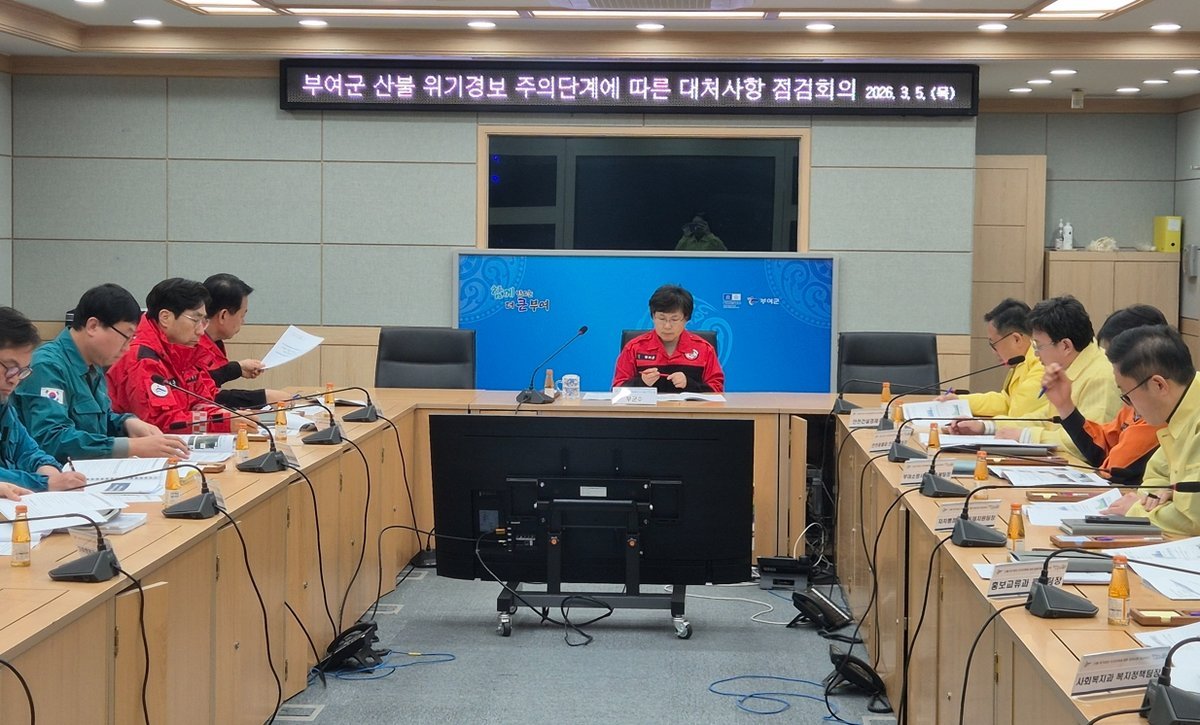 [충청25시] 충남 부여군은 산불 위기경보 ‘주의’단계에 따른 대응 태세를 강화하기 위해 지난 5일 홍은아 부군수 주재로 안전총괄과, 산림녹지과 등 관계 부서와 부여소방서 대응총괄팀 등 18명이 참석한 가운데 ‘산불 화재 대처 사항 점검 회의’를 개최했다고 밝혔다.