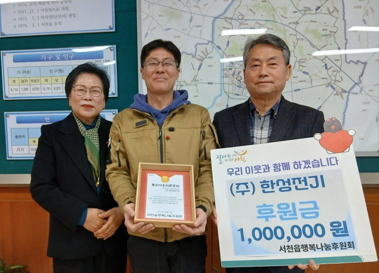 [충청25시] ㈜한성전기는 지난 19일 서천읍행복나눔후원회에 취약계층 지원을 위한 후원금 100만원을 기탁하며 ‘좋은이웃사촌 186호’로 선정됐다.