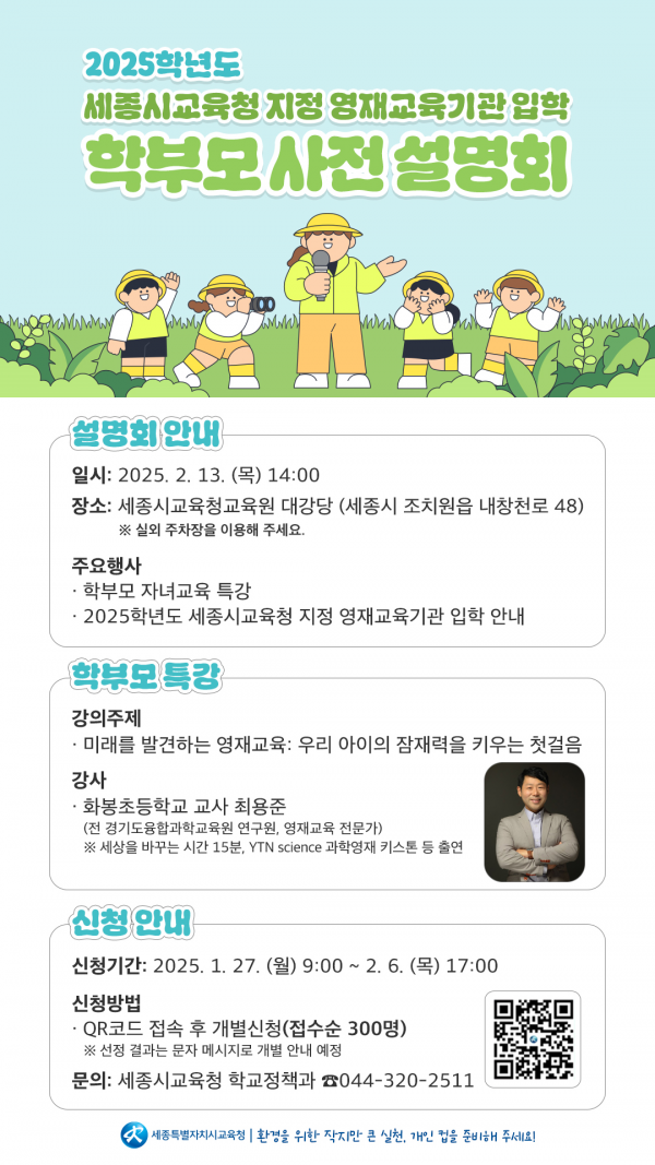 2025학년도 세종시교육청 지정 영재교육기관 입학 학부모 사전 설명회 참가는 누리집에서 오는 1월 27일 아침 9시부터 2월 6일 오후 5시까지, 접수순으로 300명까지 신청이 가능하다.