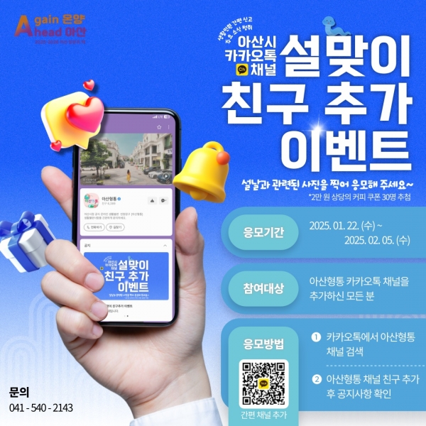 [충청25시] 아산시가 을사년 설 명절을 맞아 오는 2월 5일까지 카카오톡 채널 ‘아산형통’ 친구 추가 이벤트를 진행한다.