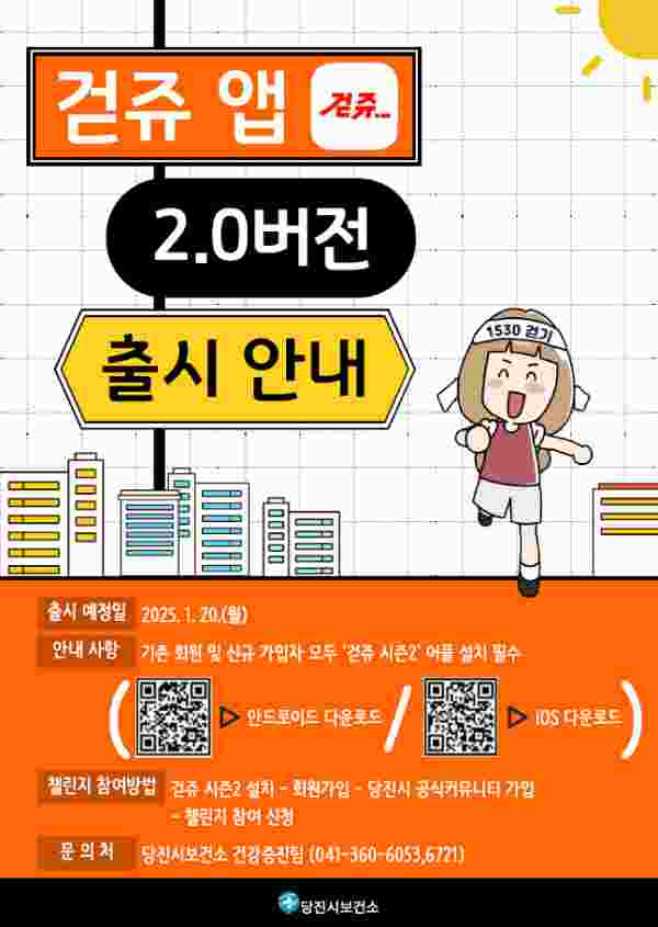 [충청25시] 당진시보건소는 새롭게 출시한 ‘걷쥬 시즌2’ 앱을 활용해 올해도 걷기 실천을 위한 다양한 프로그램과 ‘걷기 챌린지’를 2월부터 운영한다고 밝혔다.