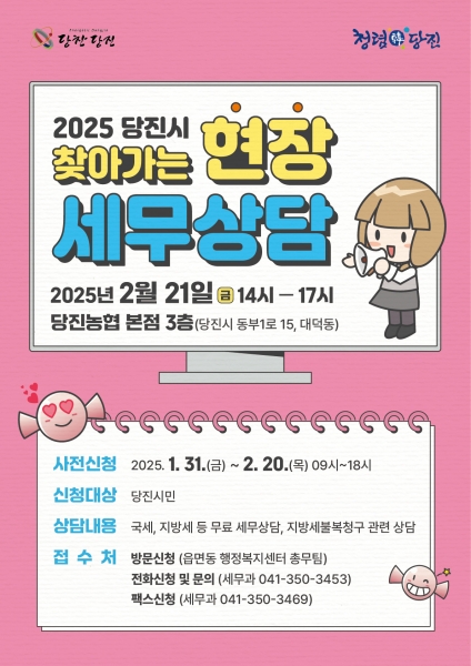 [충청25시] 당진시는 2월 21일 오후 2시부터 5시까지 당진농협 3층 대강당에서 ‘찾아가는 현장 세무상담’을 운영한다고 밝혔다.